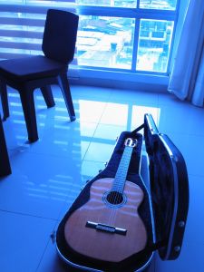 me concentro en la guitarra con su aire expectante